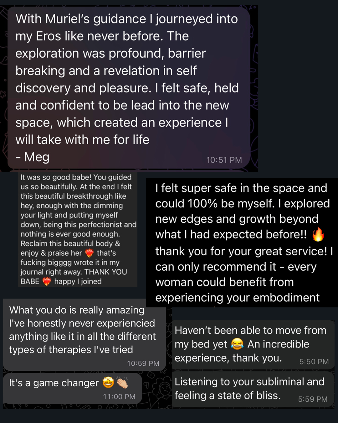Weaving together BODY, EROS and MIND Muriel creates powerful spaces that ignite and deepen your journey of liberation and expansion.